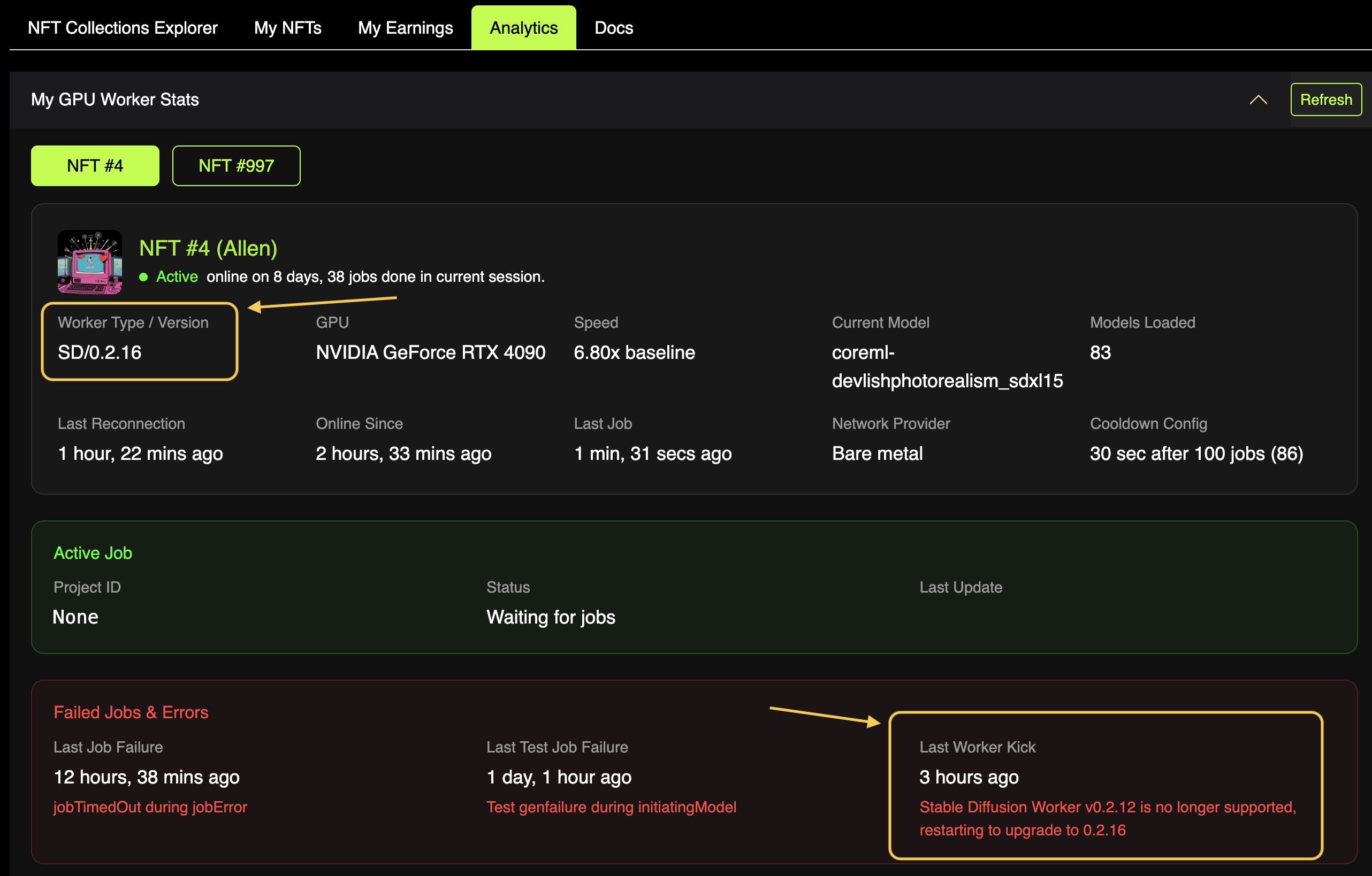 First go to nft.sogni.ai/analytics and click on "My GPU Worker Stats" to access a user-friendly analytics and debug dashboard for your worker. Here you can confirm the Worker Version you are running and if you received any "Last Worker Kick" error messages. If you this error but the version of the worker displayed is higher, and your worker is still connected to the network, you are good to go!