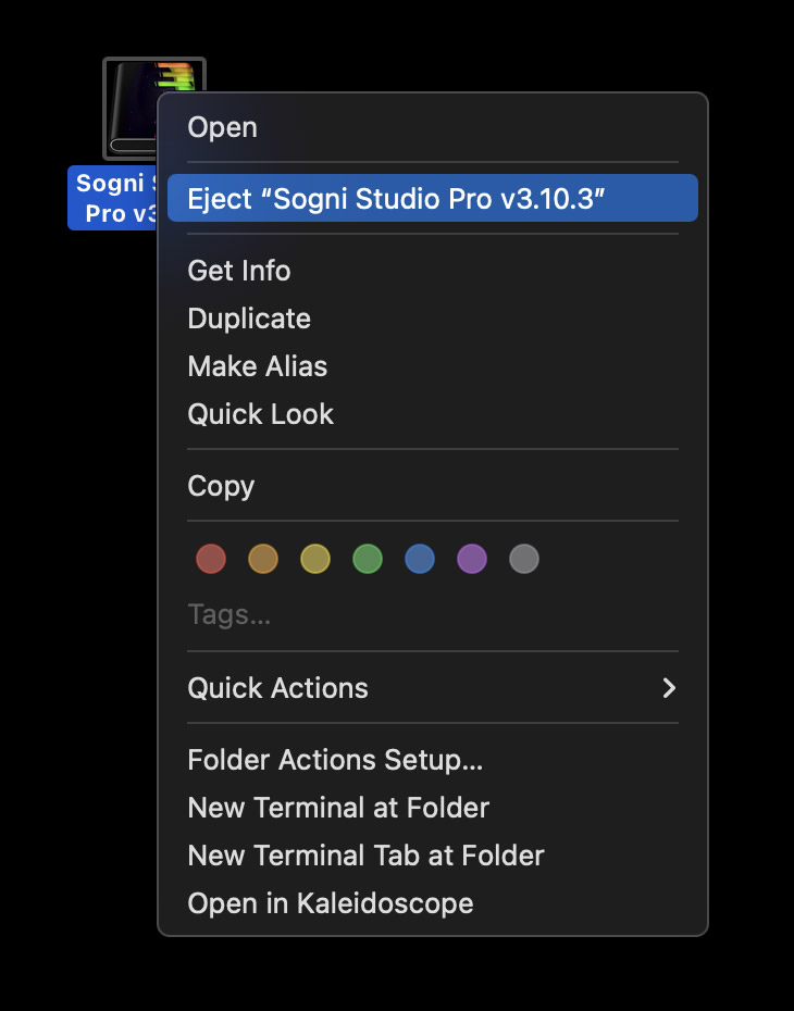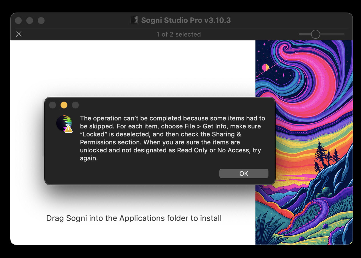 To fix this, delete the existing version of Sogni from your Applications folder. Donβt worryβyou wonβt lose any of your data or saved images. Then, try installing the new version of Sogni Studio Pro by dragging it into your Applications folder.