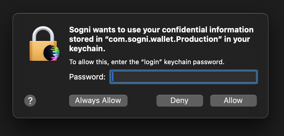 Note 2: If you are updating from a previous version of Sogni Studio installed through the App Store or Testflight, you may get a few of these dialogs in a row. Enter your device password and click "Always Allow"