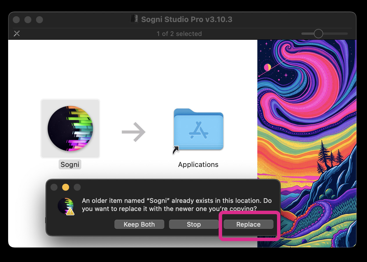If you have previously installed Sogni Studio on your Mac, or are updating your version of Sogni, you will see this alert where you need to click "Replace"