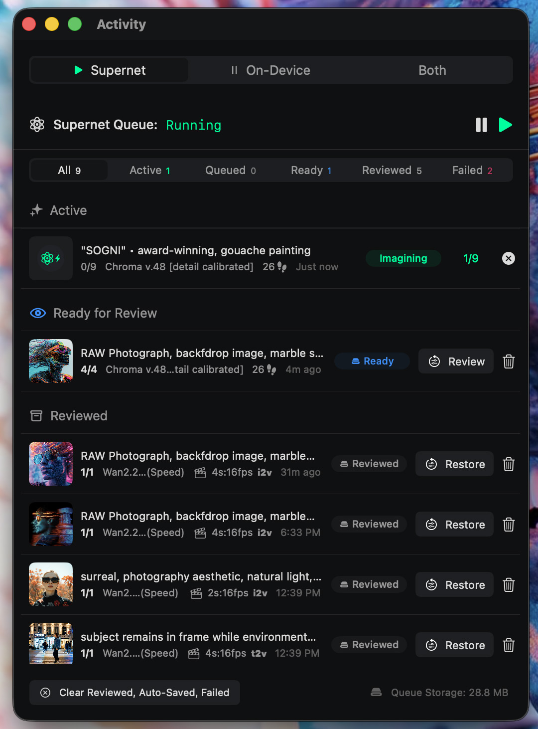 You can use both at the same time. For example, you might run on-device image jobs while video renders on Supernet, or queue long Supernet jobs while continuing local work.