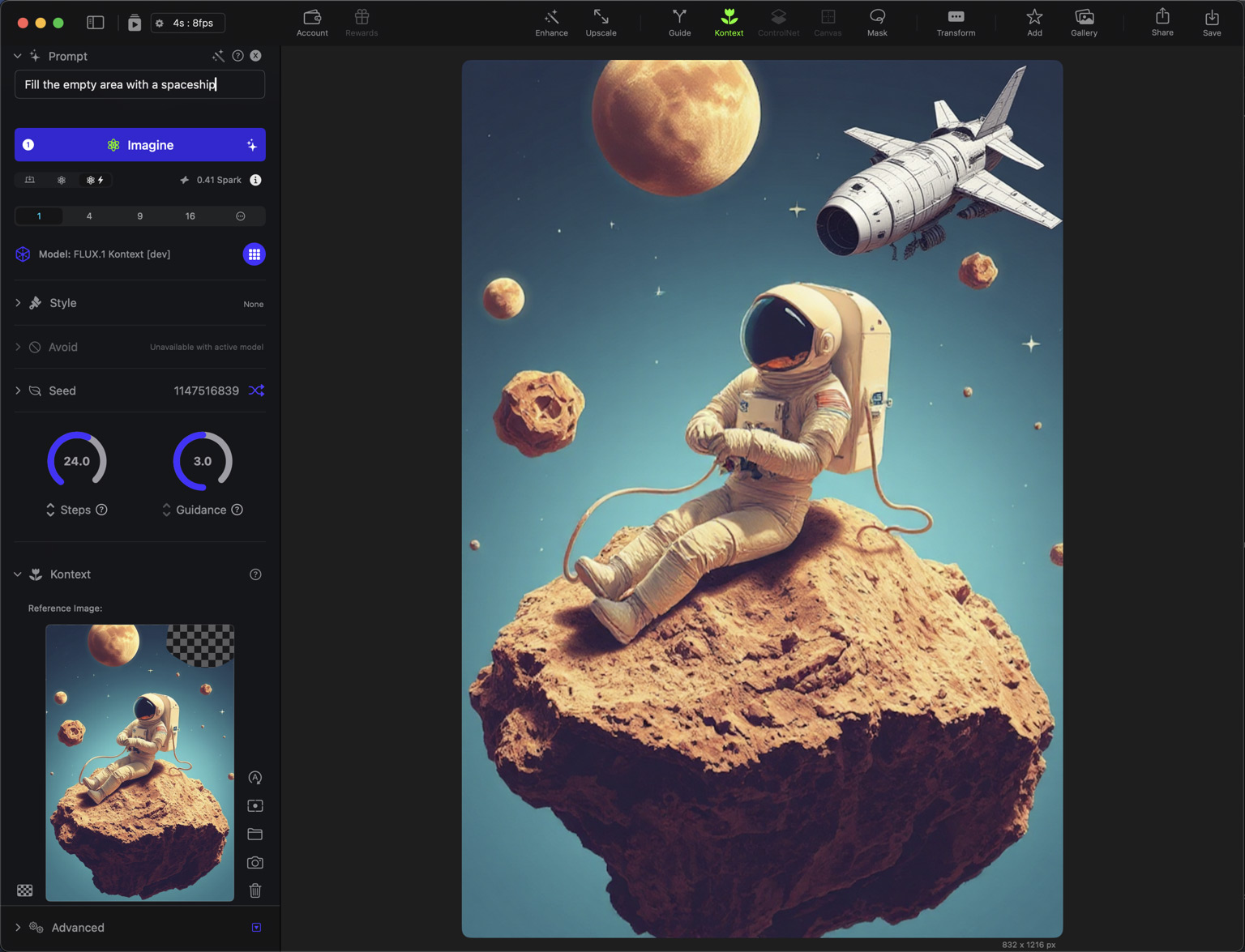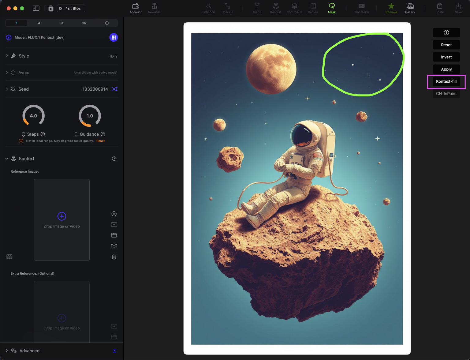 - Use the tool to clear an area, then click "Context-Fill". The masked image will be set a Kontext reference.