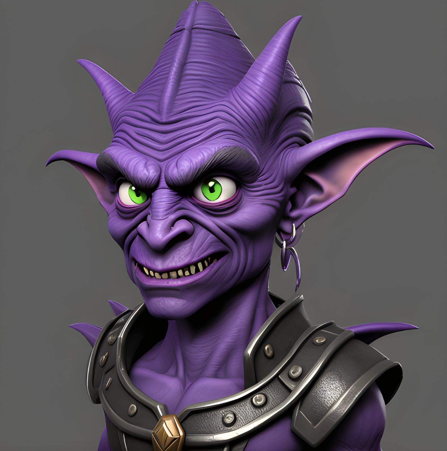 Prompt : 3d ugly evil purple goblin with big nose, big eyes. Hoop earring. Head and shoulders