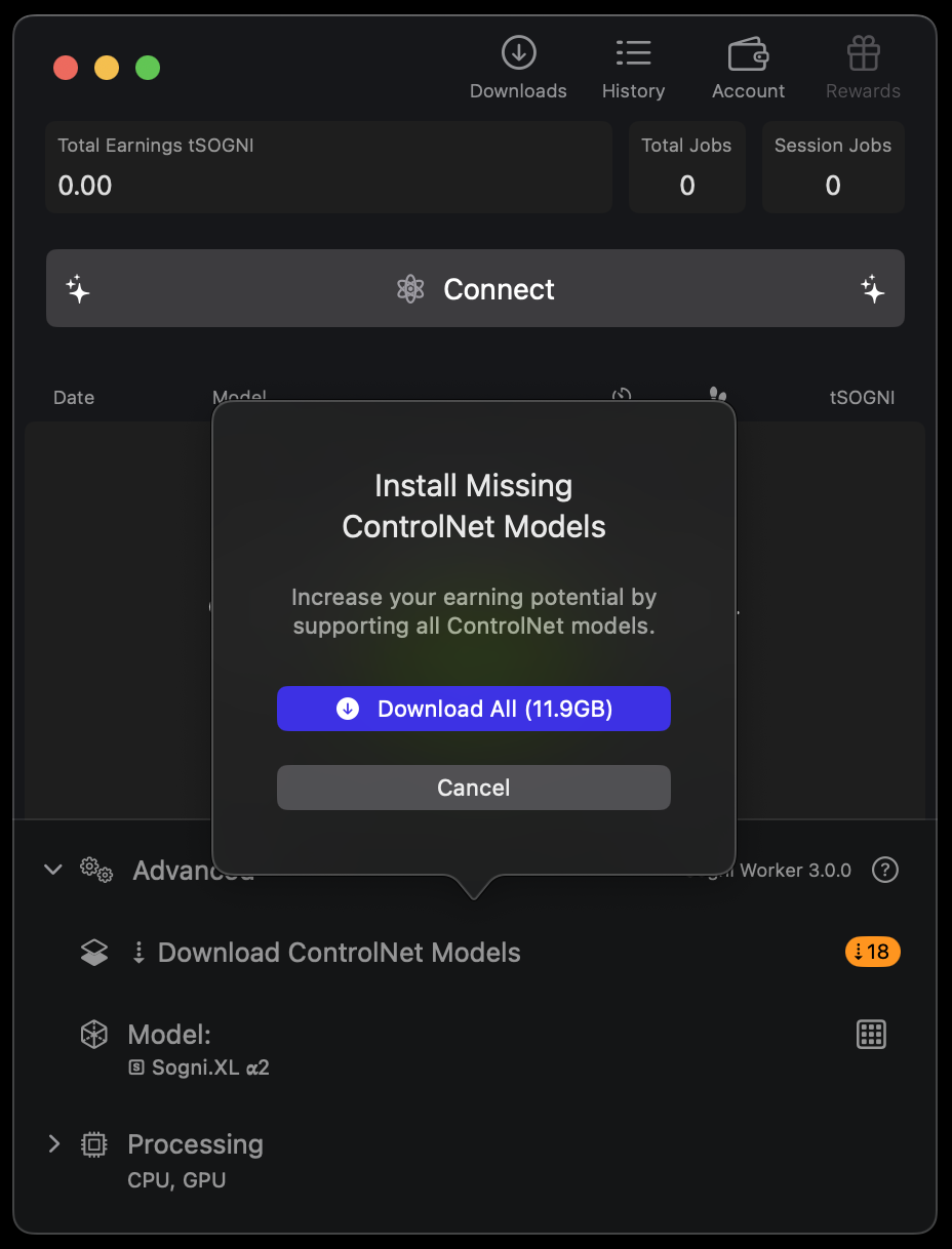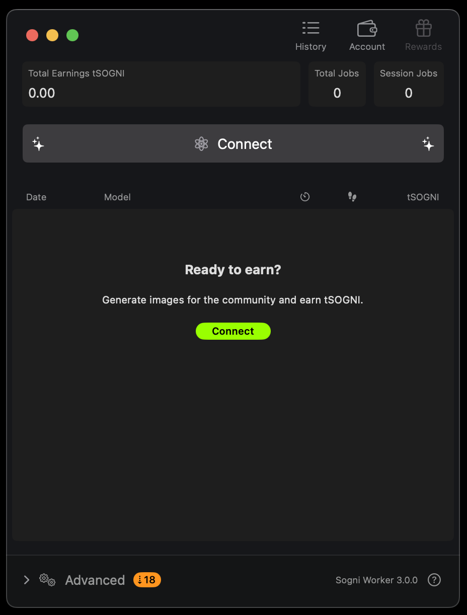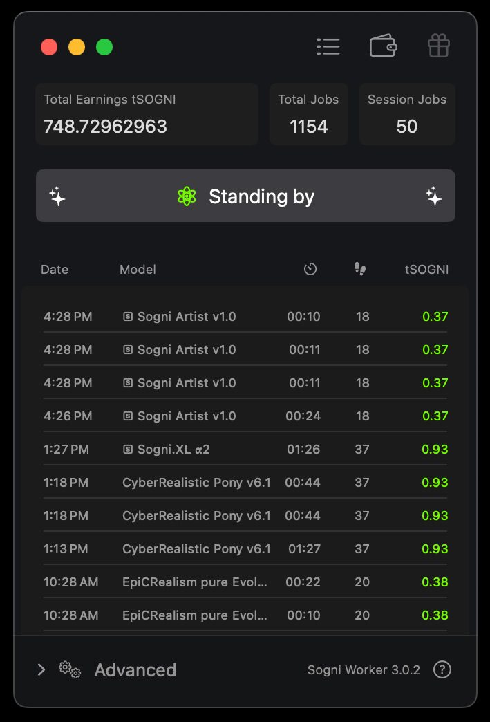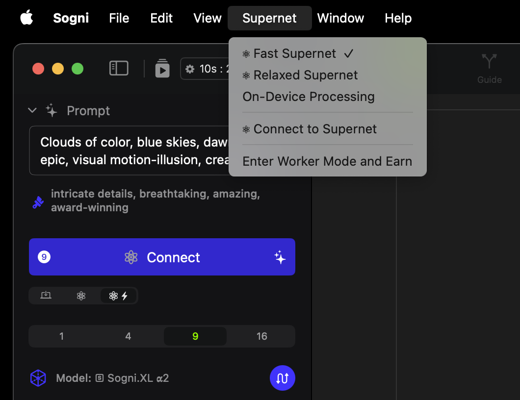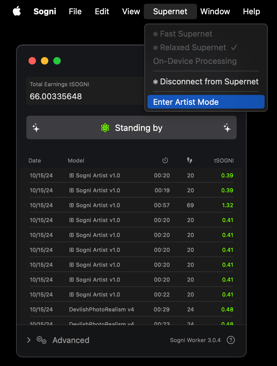 Worker Mode lets you join the Supernet by sharing your idle compute power with fellow artists. Your Mac will generate images for the community—and you’ll earn SOGNI tokens in return.
