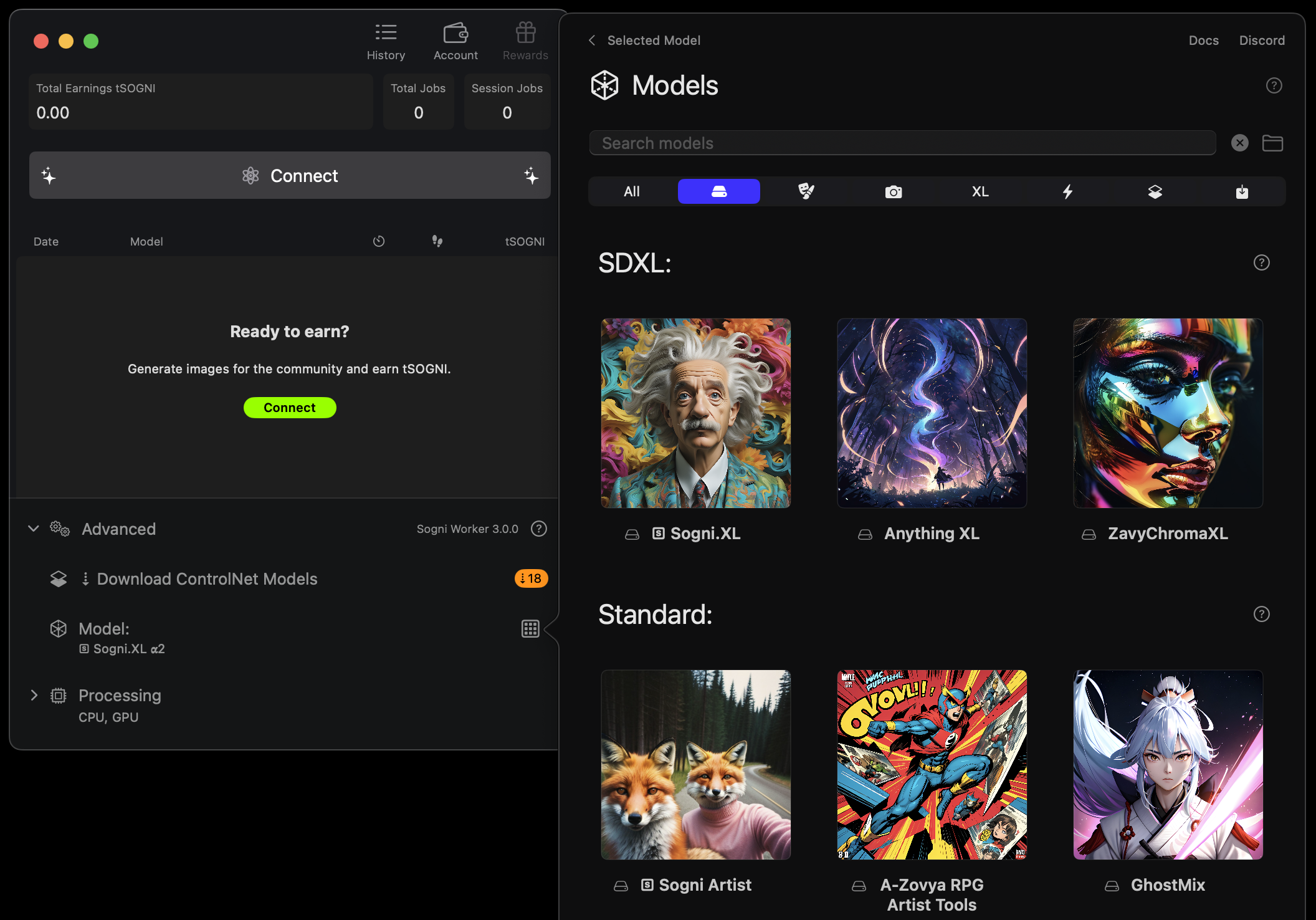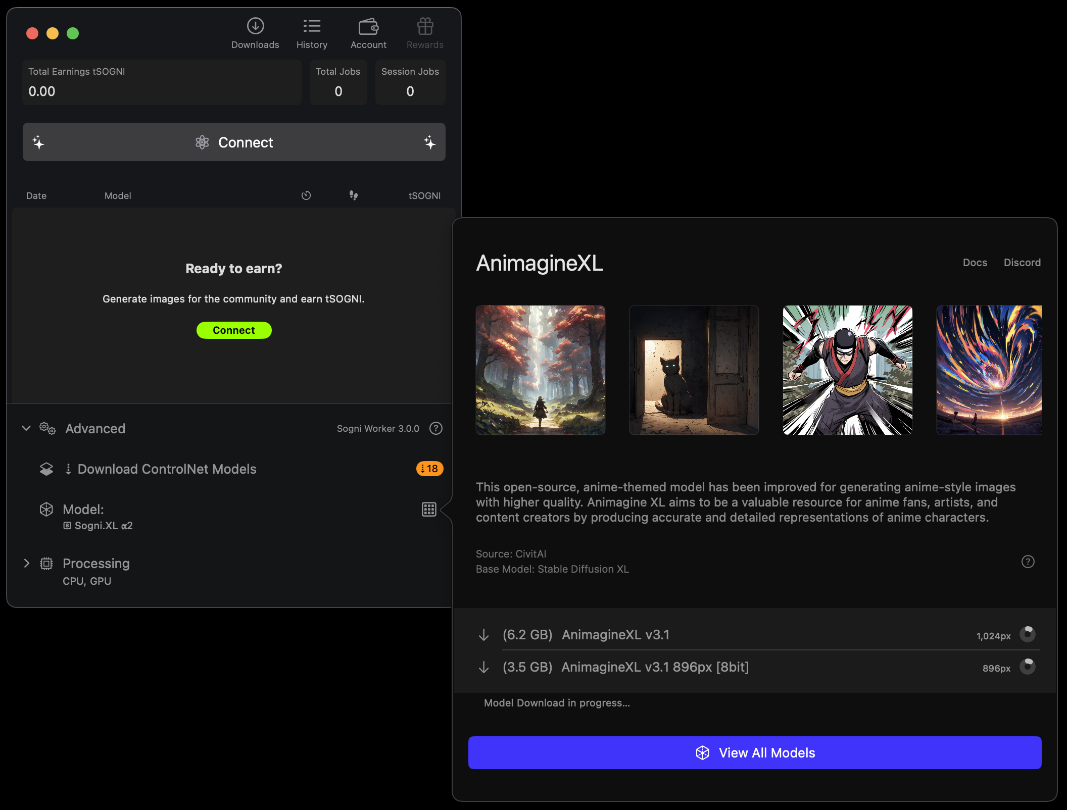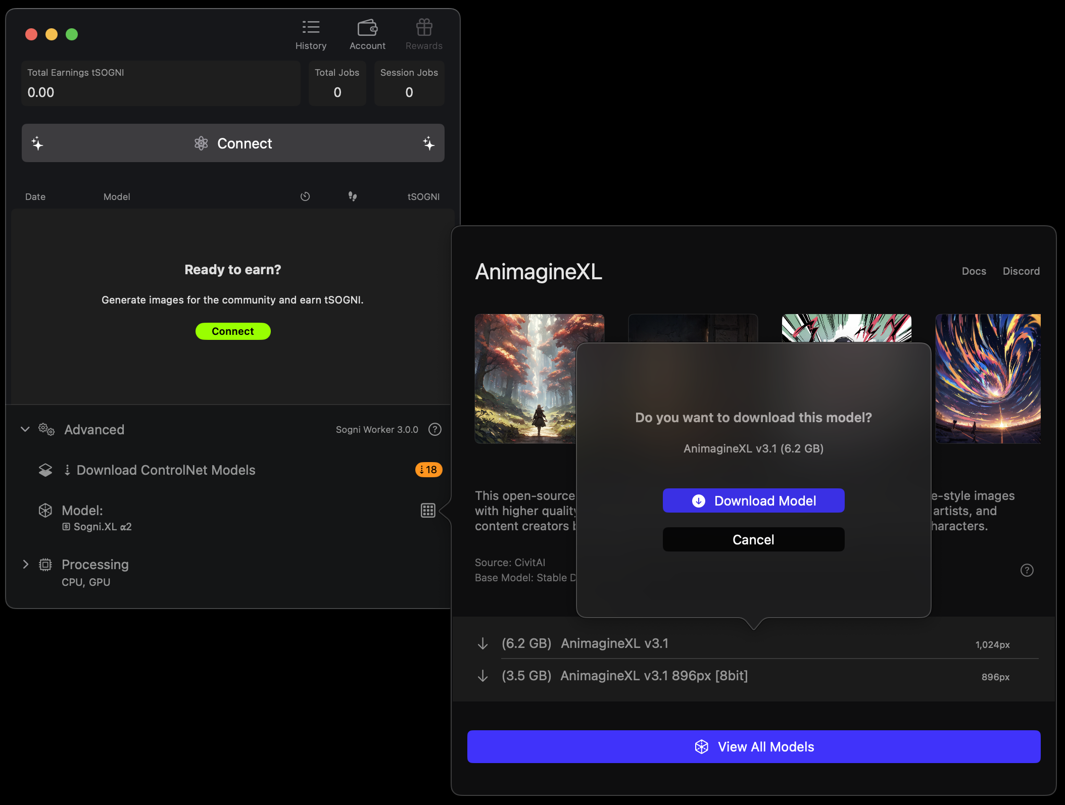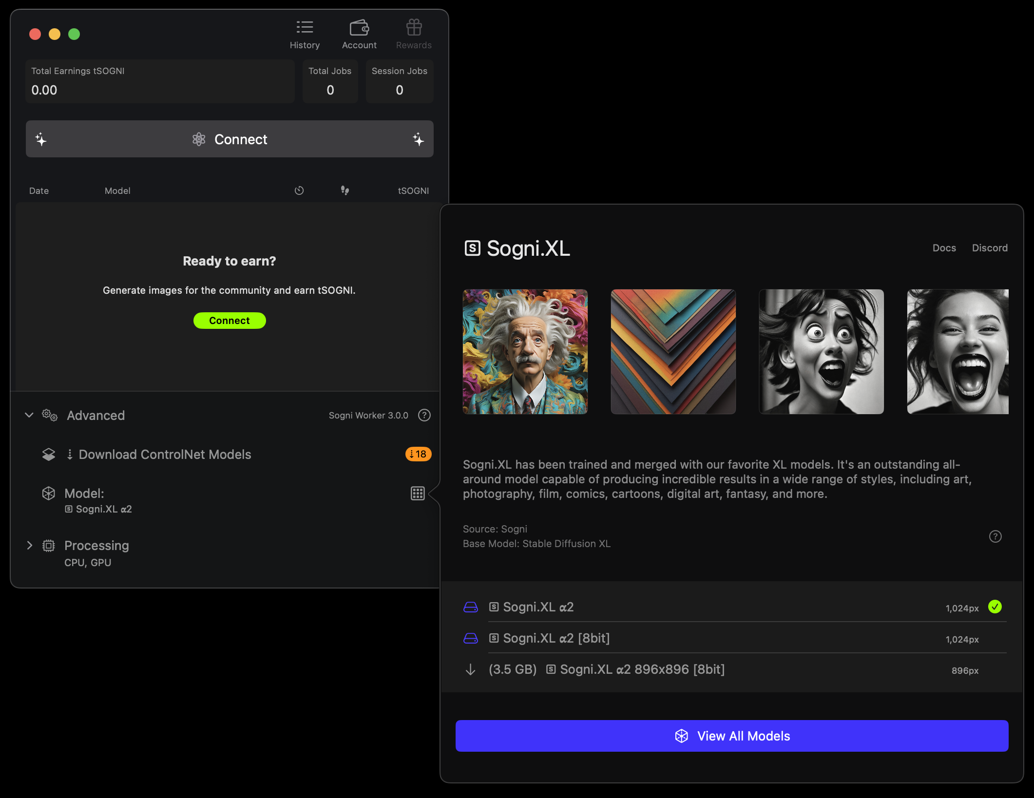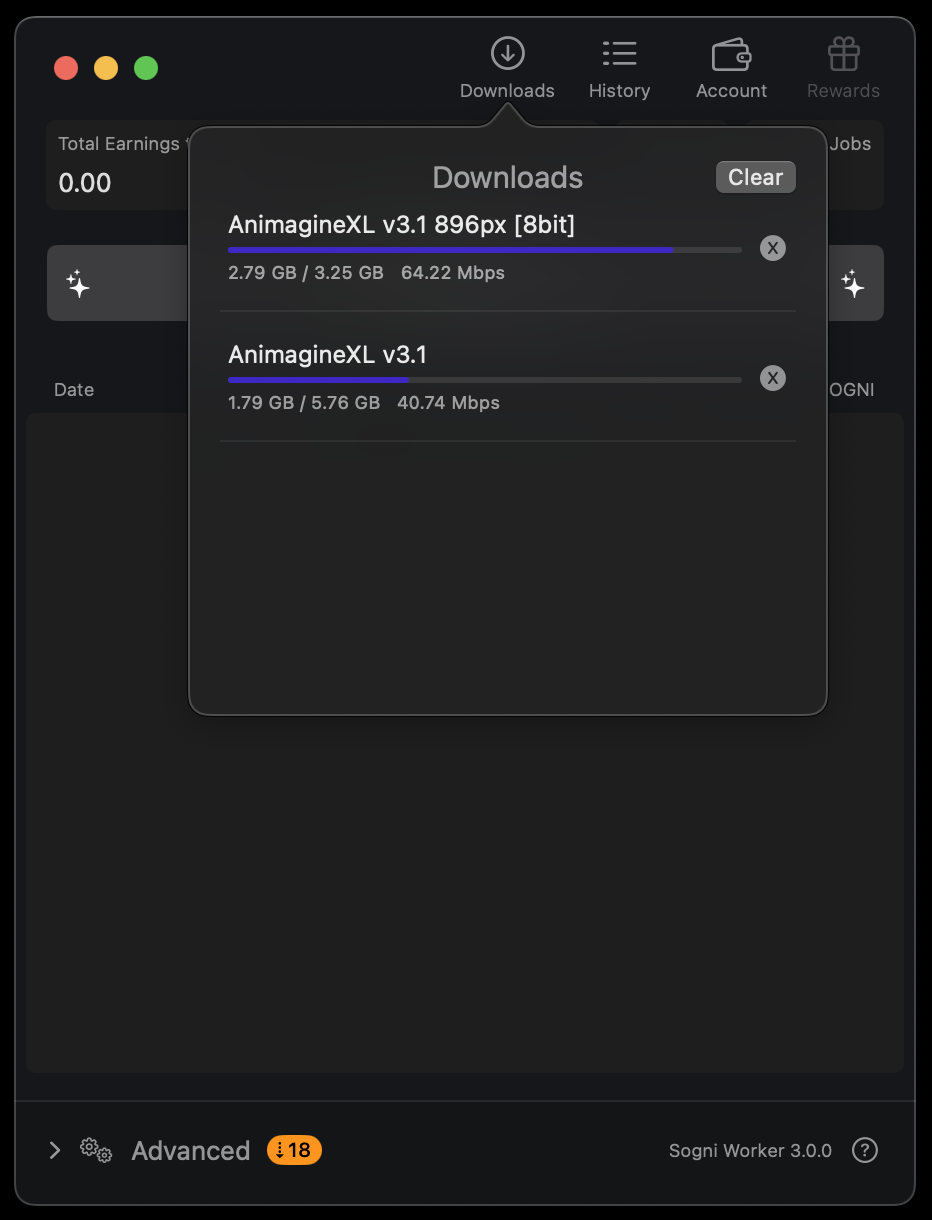 Worker Mode lets you join the Supernet by sharing your idle compute power with fellow artists. Your Mac will generate images for the community—and you’ll earn SOGNI tokens in return.