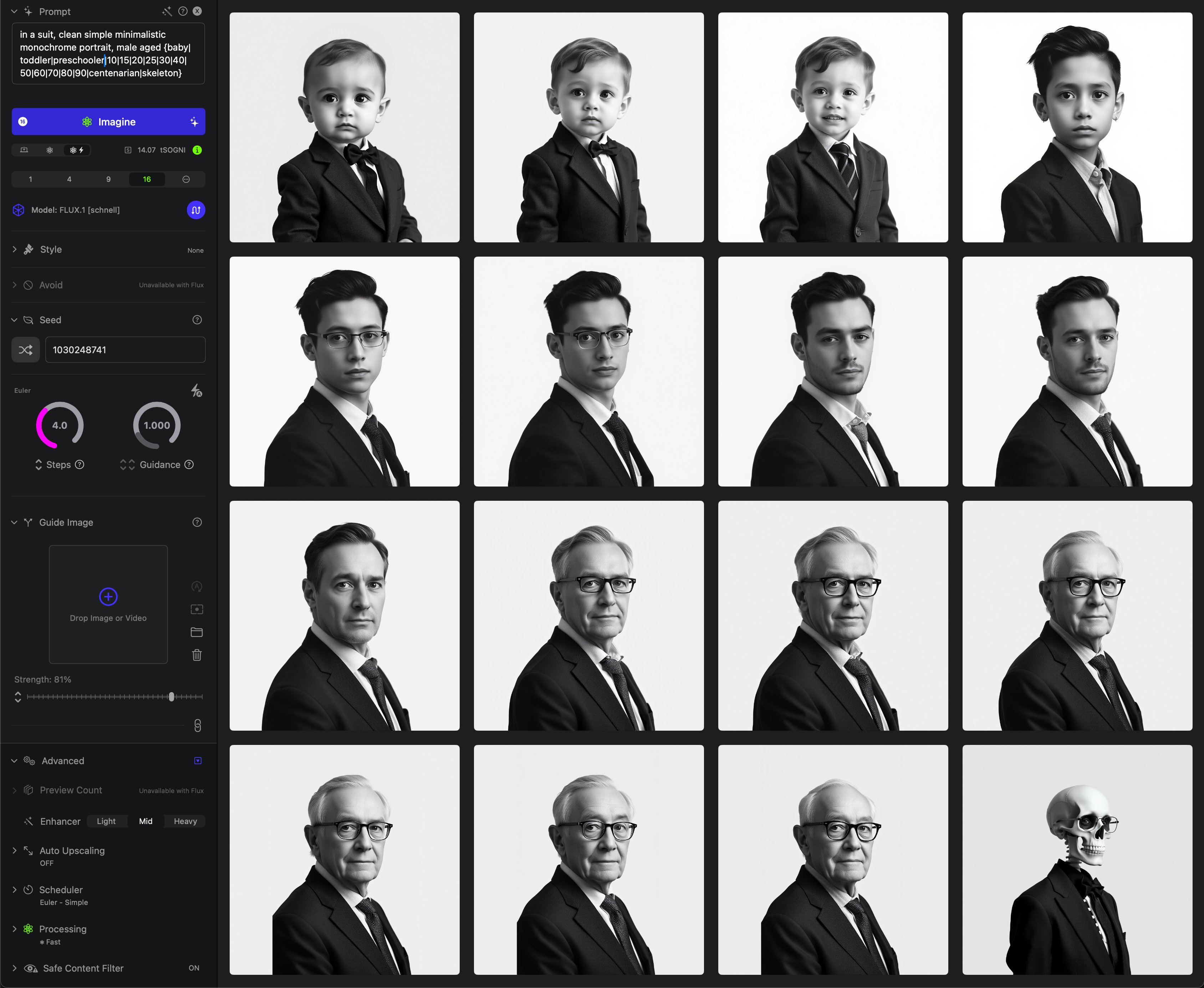 Prompt: in a suit, clean simple minimalistic monochrome portrait, male aged {baby | toddler | preschooler | 10 | 15 | 20 |30 | 40 | 70 | 80 | 90 | centenarian | skeleton}