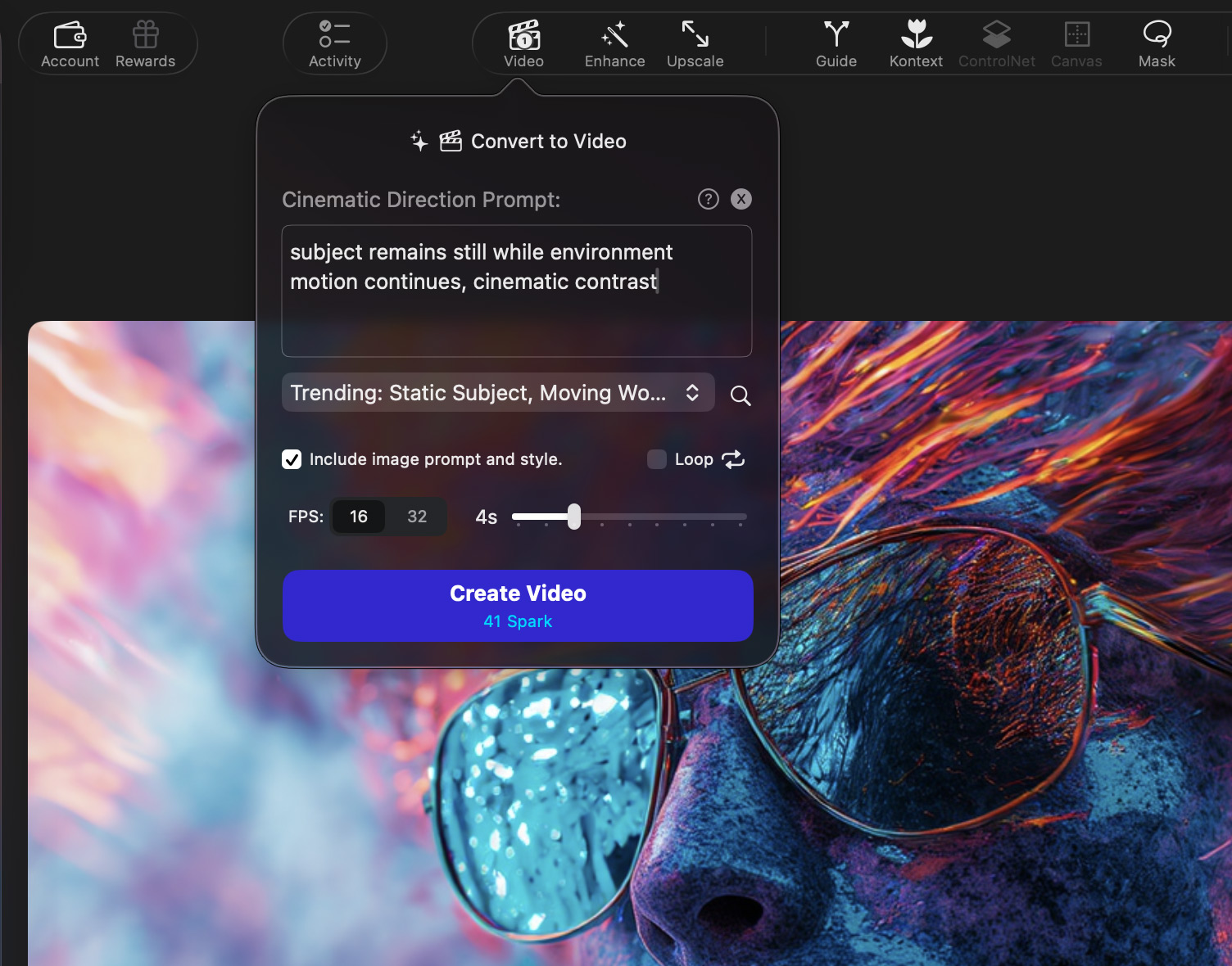 Convert to Video is the fastest way to bring a single image to life. It turns an existing image into a short video clip by adding motion, pacing, and cinematic directionβwithout requiring a full video setup.