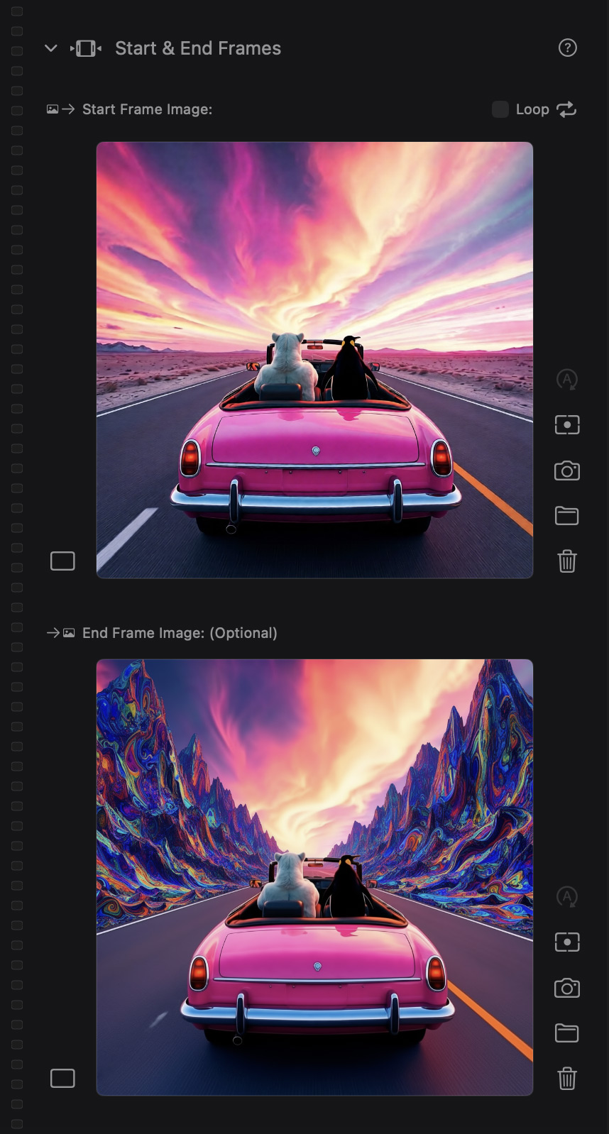 The End Frame is optional, but can be used to steer where the motion resolves, reduce drift, or encourage cleaner loops.