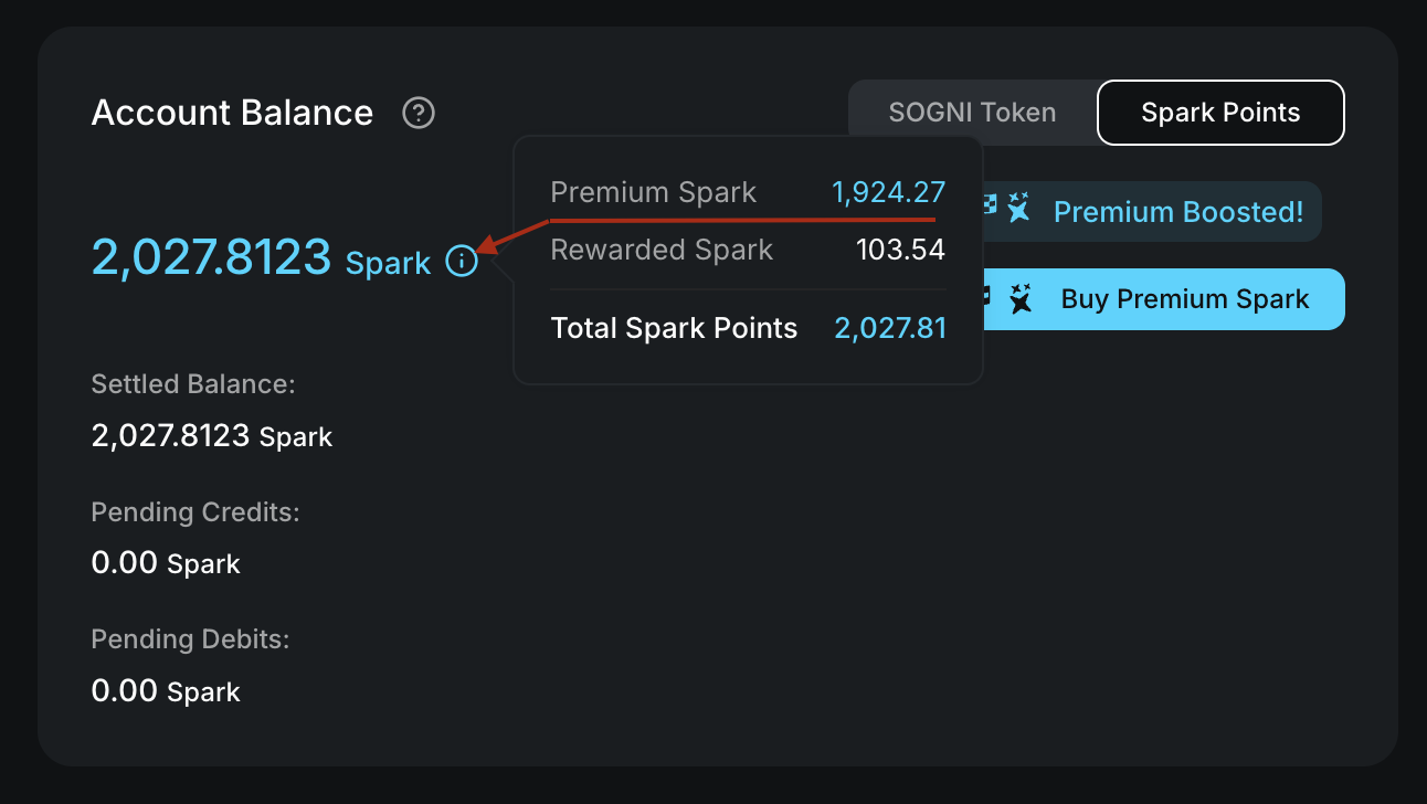 Not all Sogni Spark is created equal. Some Spark is marked as Premium Spark: Spark you've purchased, earned as a worker (when claimed as Spark), or won in contests. Purchasing and using Premium Spark is the easiest way to support the Sogni Supernet community and offers a host of benefits.