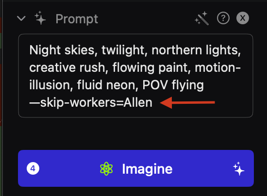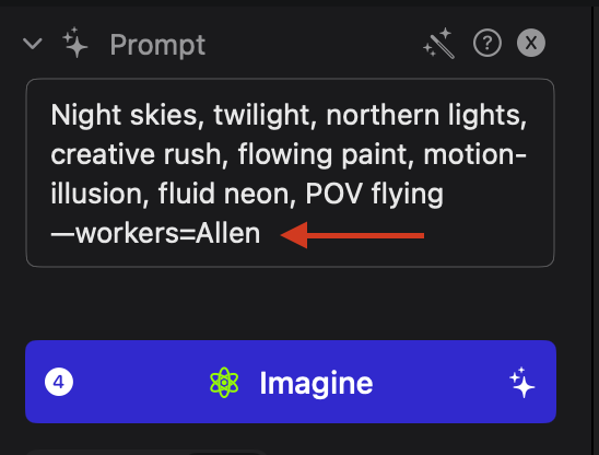 β’ Workers can be targeted by adding the a tag directly into your prompt like so: --workers=WORKER_USERNAME_OR_NFT_TOKEN_ID. All workers who match the username are targeted.